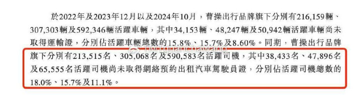在合规方面,曹操出行更是漏洞百出。据招股书披露,报告期各期,曹操出行旗下均有大量活跃车辆和司机未取得相应的运输证和网络预约出租汽车驾驶员证。于2022年及2023年12月以及2024年10月,曹操出行品牌旗下分别有216,159辆、307,303辆及592,346辆活跃车辆,其中34,153辆、48,247辆及50,942辆活跃车辆尚未取得运输证,分别占活跃车辆总数的15.8%、15.7%及8.60%。同期,曹操出行品牌旗下分别有213,515名、305,068名及590,583名活跃司机,其中38,433名、47,896名及65,555名活跃司机尚未取得网络预约出租汽车驾驶员证,分别占活跃司机总数的18.0%、15.7%及11.1%。这一数据不仅令人震惊,更暴露了公司在合规管理上的严重缺失。