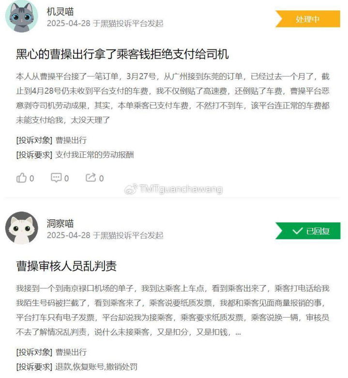 此外,曹操出行不仅被乘客投诉,还遭到自家平台司机的“吐槽”。黑猫投诉平台显示,共有1万多条投诉中包含搜索词曹操出行,相关内容包括乱收乘车费、平台对司机恶意罚款、判责不合理等。